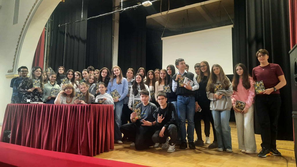 La Colegiul Coșbuc, întrebările au pornit de la copertă – florile mov, fularul alb – și au urcat spre teme sociale și morale. Copii foarte inteligenți, dar și romantici: în curtea lor interioară au plantat sisinei în toate culorile.