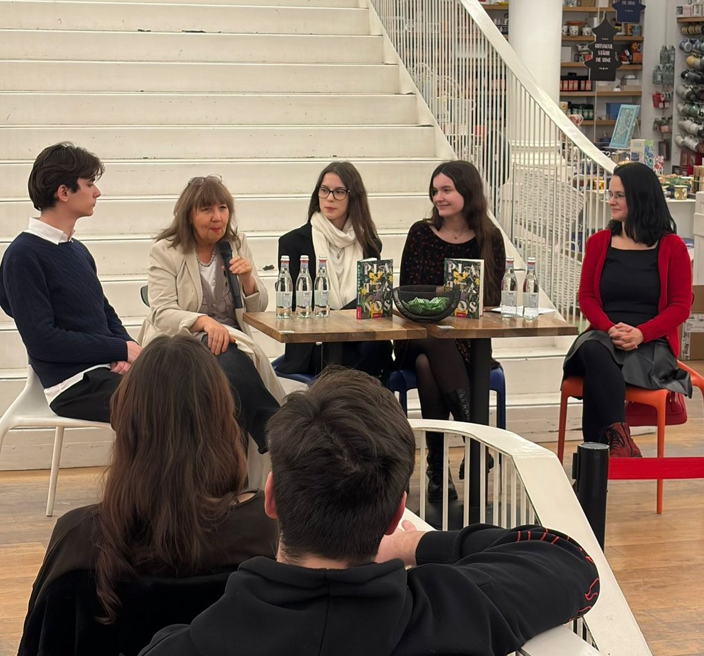 La Colegiul Coșbuc, întrebările au pornit de la copertă – florile mov, fularul alb – și au urcat spre teme sociale și morale. Copii foarte inteligenți, dar și romantici: în curtea lor interioară au plantat sisinei în toate culorile.